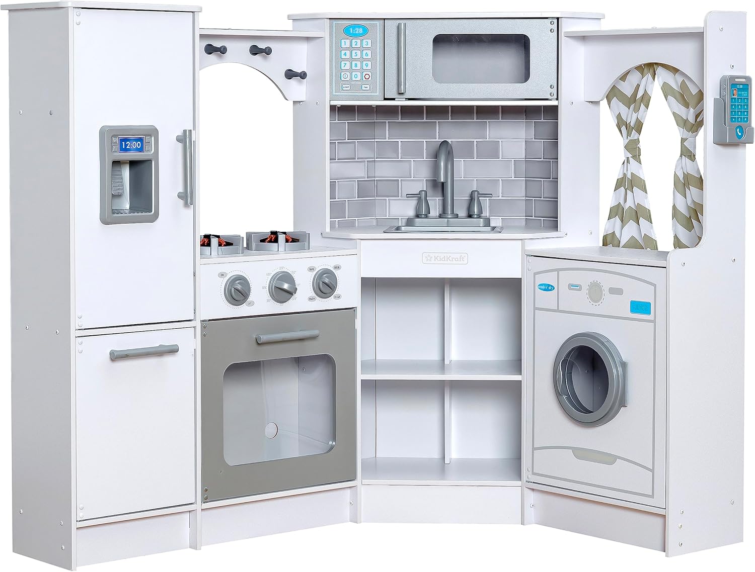 Kids will have lots of fun using the knobs to turn, buttons to press, and handles to pull. It’s an excellent way for them to learn the basics of cooking. The kitchen also has plenty of storage space, a wall phone, and fabric curtains for a cosy atmosphere.